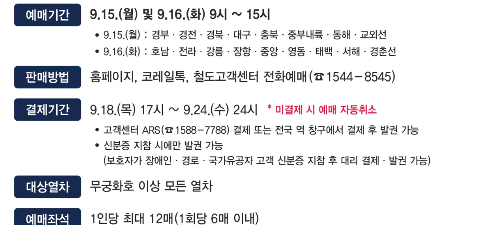 - 결제기한: 기본은 9.18.(목) 17시 ~ 9.21.(일) 24시. 다만 안내문 기준으로 사전예매(장애인·경로·국가유공자)는 고객센터 ARS(☎1588-7788) 결제 또는 역 창구 결제·발권을 활용할 수 있으며, 9.24.(수) 24시까지 가능한 항목이 별도로 있습니다.