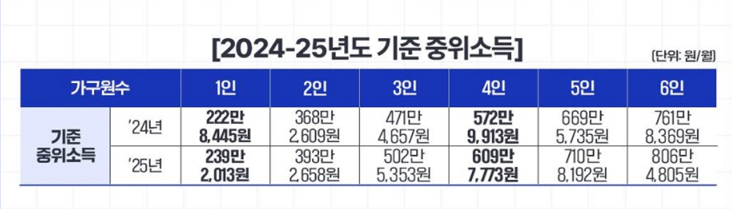 - 소득 기준 : 기준중위소득 일정 비율 이하. 비율·산식은 매년 변동되며 지자체 고시를 따릅니다.