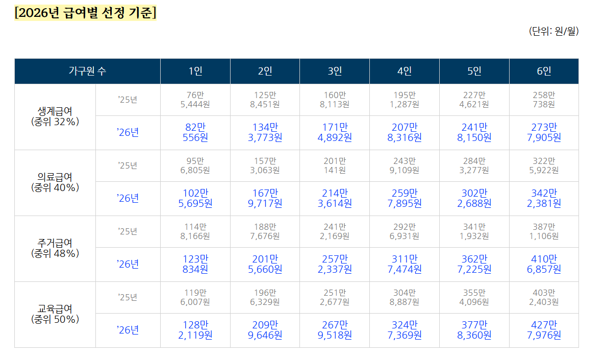 급여별 선정 기준은 ’25년에 이어 ’26년에도 동일한 비율(생계 32%, 의료 40%, 주거 48%, 교육 50%)이 적용됩니다.